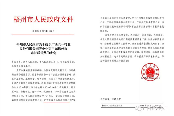 近日,梧州市人民政府發(fā)布《關(guān)于授予廣西五一管業(yè)股份有限公司等企業(yè)第三屆梧州市市長質(zhì)量獎的決定》,廣西梧州茶廠榜上有名,榮獲第三屆梧州市市長質(zhì)量獎。這是梧州茶廠繼2016年獲得第二屆梧州市市長質(zhì)量獎提名獎以來…